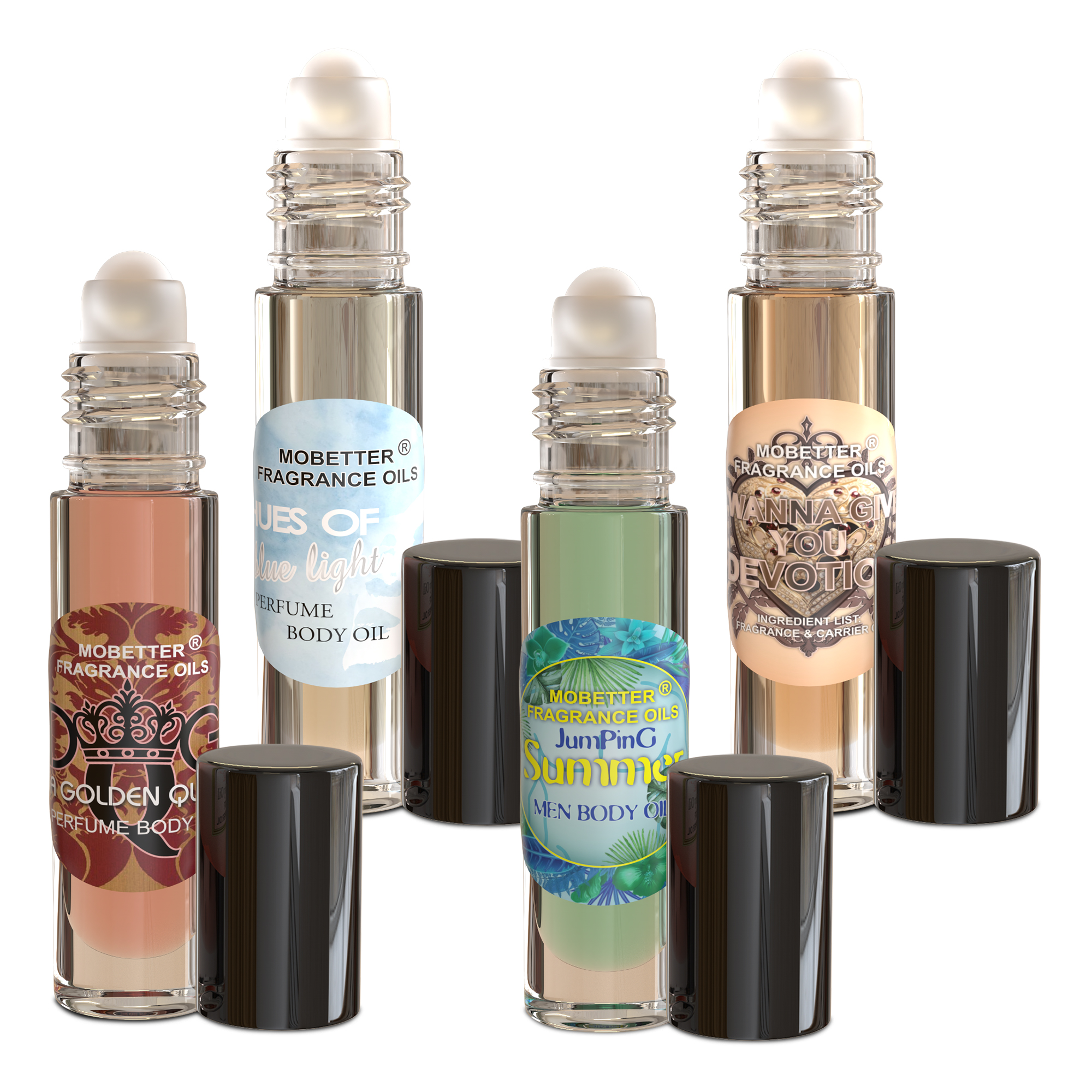 Unisex Perfume Body Oil Bundle – Set of 4 Roll-On | Hues of Blue Light, I Wanna Give You Devotion, Da Golden Queen, Jumping Summer